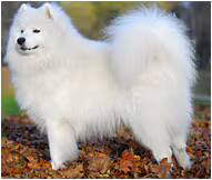 Los samoyedos son perros robustos y de complexión robusta, con una cola esponjosa y emplumada, enroscada sobre el lomo y caída hacia un lado. Las orejas son puntiagudas y la cabeza ancha. Las comisuras de los labios se curvan hacia arriba para dar la característica "sonrisa de Sammie". Los samoyedos deben tener una pigmentación oscura alrededor de los ojos, la nariz y los labios a pesar del color blanco del pelaje. El brillante pelaje blanco es la gloria de la raza samoyedo. Como es de esperar en una raza de origen nórdico, este es un pelaje grueso, áspero y liso con una capa interna muy densa. El color es un blanco llamativo, aunque se permiten tonos bizcocho o crema. El pelaje sobresale del cuerpo, lo que le da una apariencia esponjosa al samoyedo.